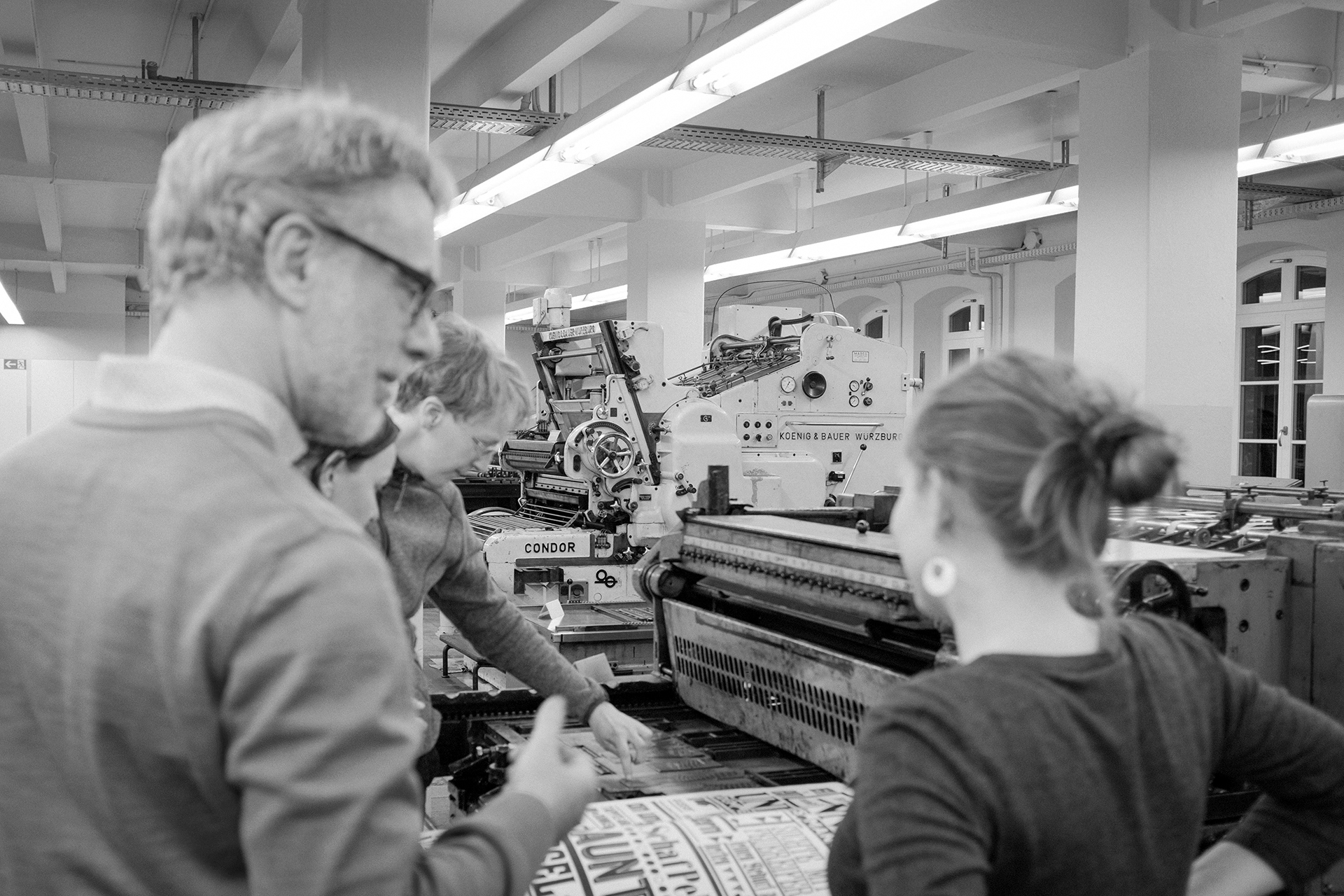 Die Idee, eine Art „Druckerstammtisch“ ins Leben zu rufen und damit zur aktiven Förderung der Druckkunst einzuladen, spukte mir schon lange durch den Kopf. Ich wollte alle Kollegen und Partner, die mir ans Herz gewachsen sind und mit denen ich beruflich viel zu tun hatte, zusammenbringen – mal ohne Zeitdruck, abseits gemeinsamer Aufträge und Projekte fachsimpeln. Mir war bewusst, dass wir alle mit unserer Arbeit schon sehr ausgelastet sind. Umso gespannter war ich darauf zu sehen, wie viele meiner Einladung folgen würden und wurde positiv überrascht. Am Ende kamen 21 Personen am 19. Januar 2017 ins Museum für Druckkunst nach Leipzig. Die Kombination aus produzierender Werkstatt und Museum, in der Industriekultur lebendig und 500 Jahre Druckgeschichte erlebbar gemacht werden, war aus meiner Sicht der perfekte Ort für die Zusammenkunft und damit die Geburtsstunde des Polygrafen Kollektivs.