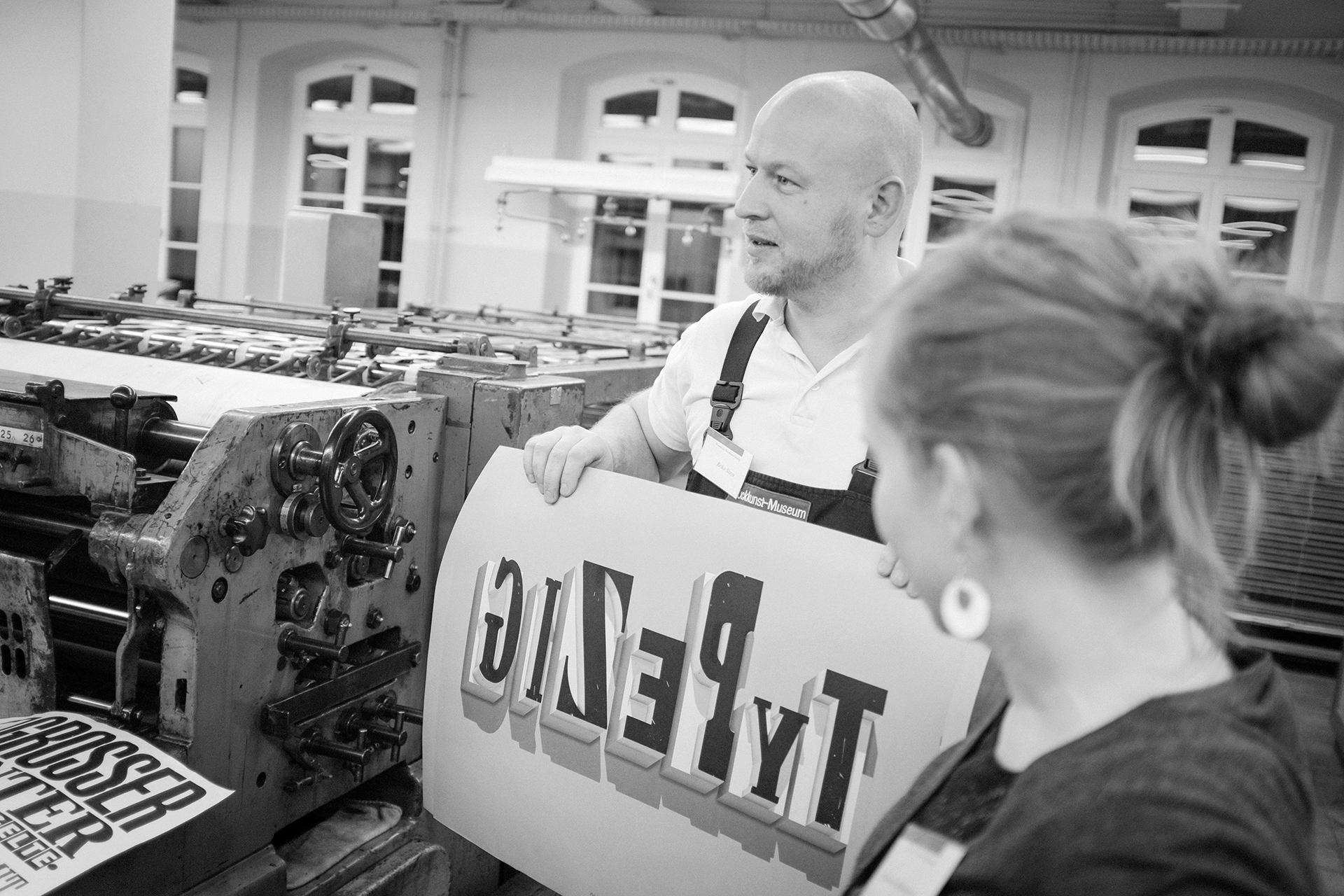 Zur Einstimmung wurden wir von Susanne Richter, Christine Hartmann und Reiko Stoye durchs Museum geführt, die ein oder andere Maschine angeschaltet und viele unserer Fragen beantwortet. Natürlich wurde auch gleich die Gelegenheit genutzt, die Gesellschaft zur Förderung der Druckkunst Leipzig e.V. vorzustellen. Die Ziele des Vereins, siehe Satzung, entsprechen genau unserem Anliegen: „[…] vorhandene Technikfeindlichkeit abzubauen, Berufsstolz zu fördern und die Menschen mit den herausragenden Leistungen der Stadt Leipzig wie auch des graphischen Gewerbes vertrauter zu machen.“